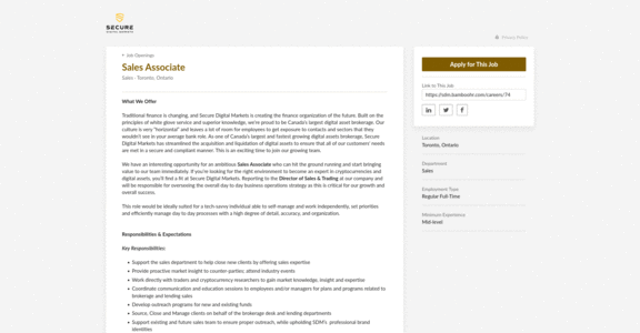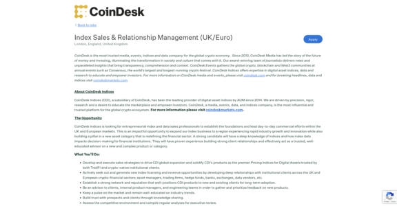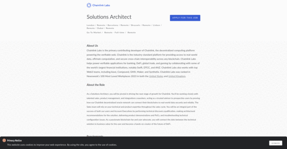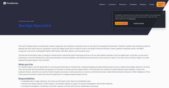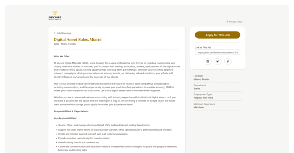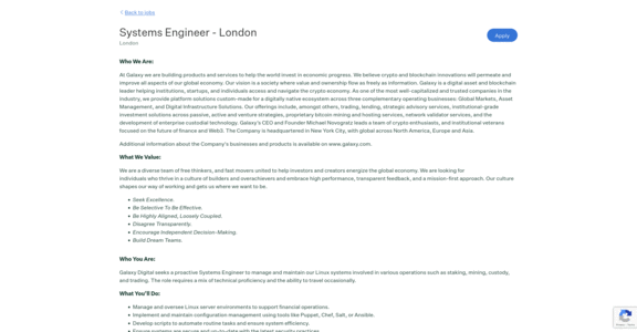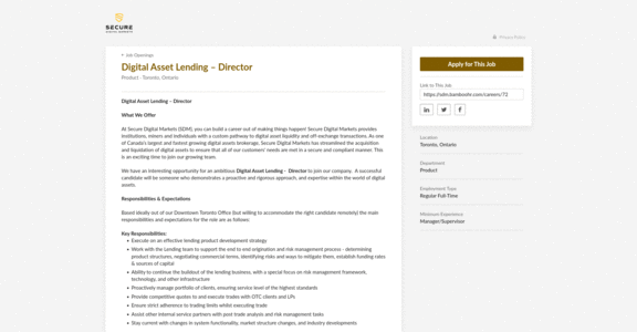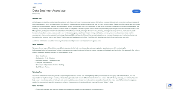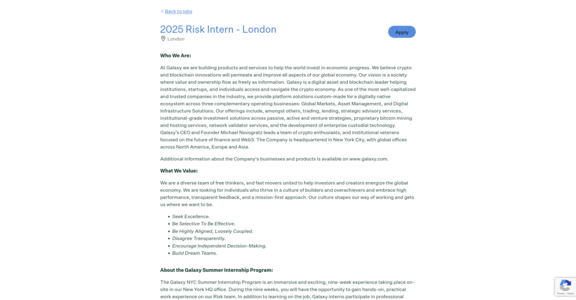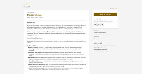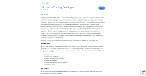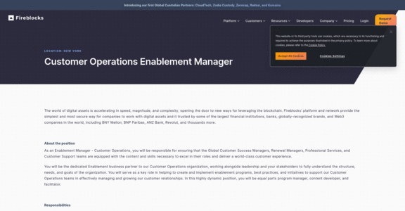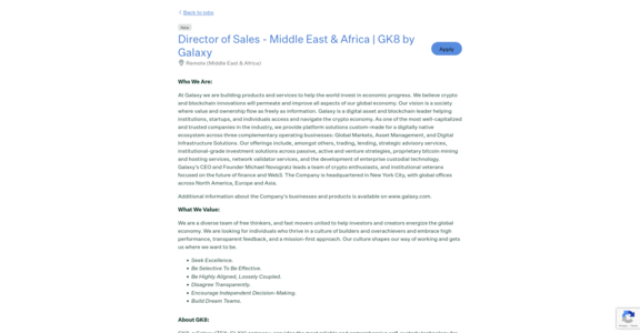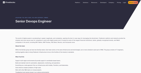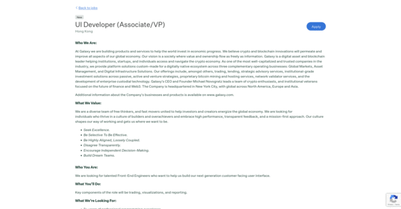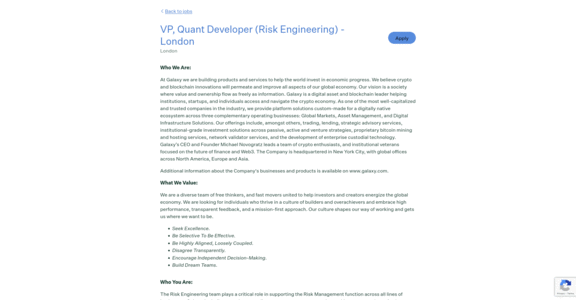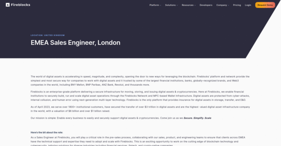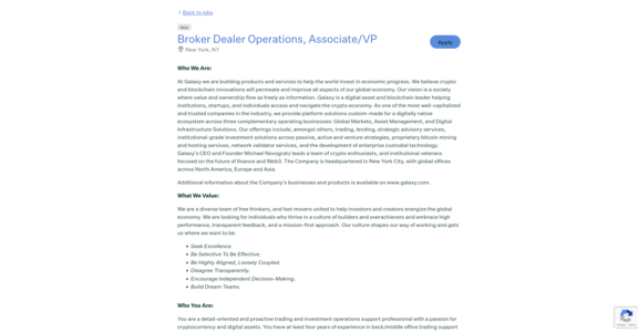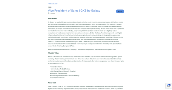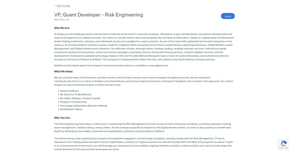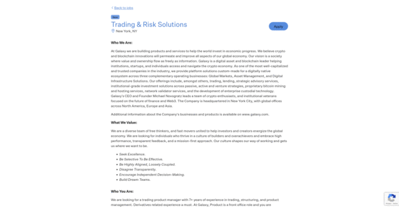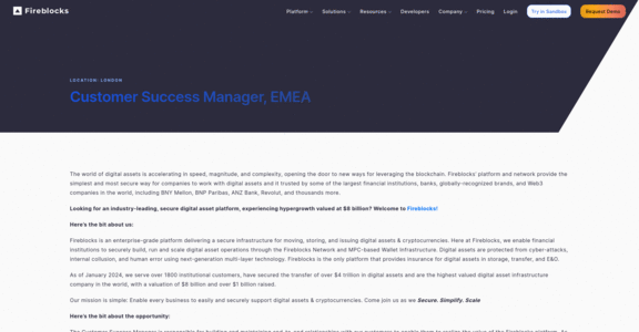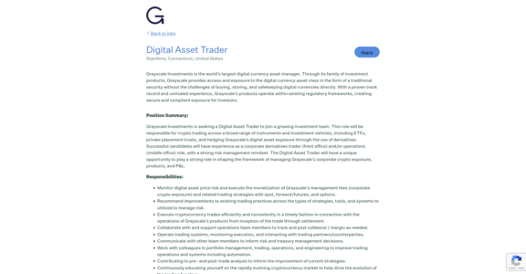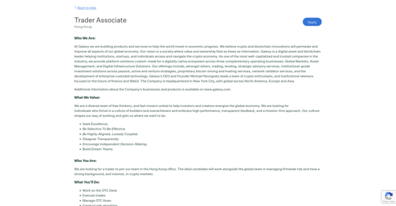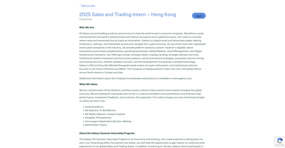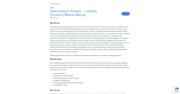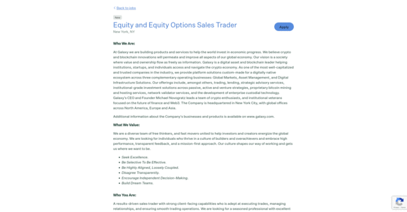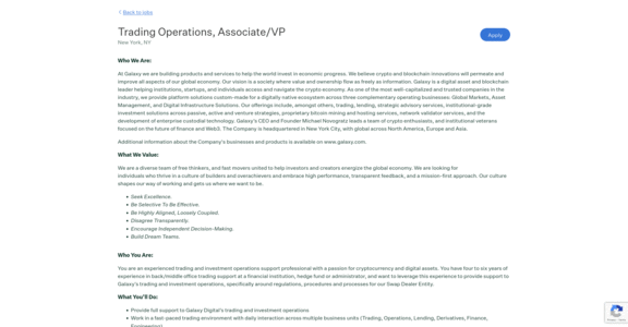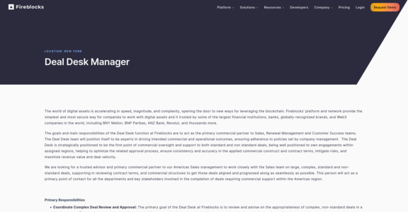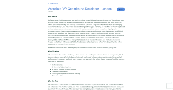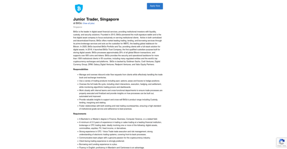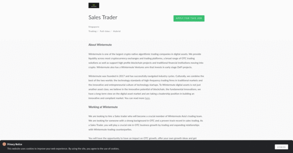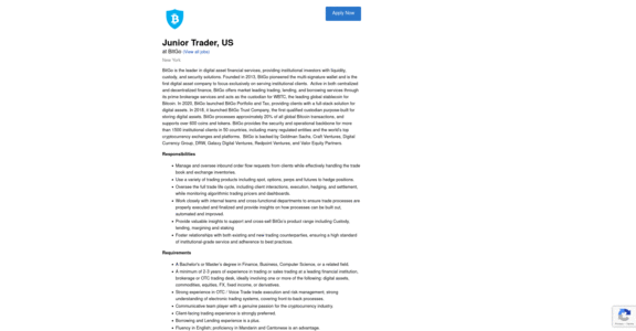 This sales trader position requires a strong background in OTC trading, with a focus on cryptocurrency markets and derivatives. It offers the opportunity to work in an innovative and entrepreneurial culture with potential for accelerated responsibilities compared to traditional finance environments.