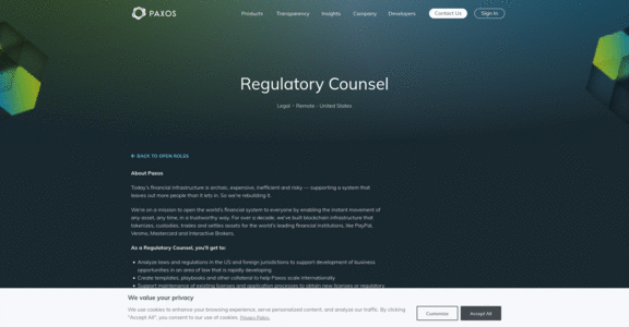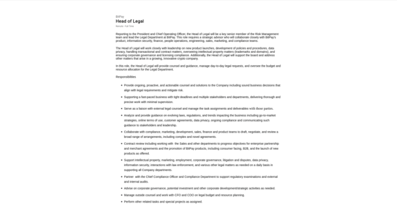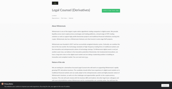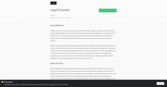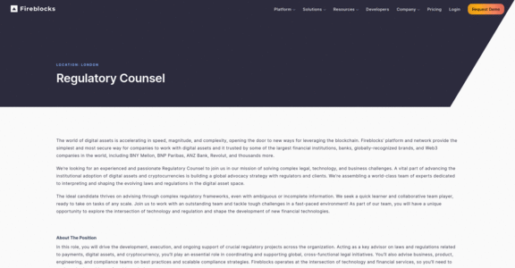 This job for Legal Counsel position requires a strong understanding of commercial law in relation to financial services and regulatory themes, which is typical for similar roles in the fintech and crypto industry.