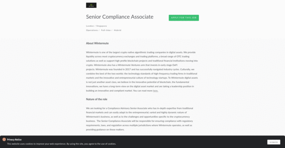 This job requires extensive experience in compliance, particularly in the context of proprietary trading and crypto, setting it apart from similar roles that may be less focused on digital assets and algorithmic trading.