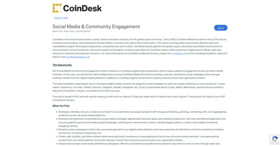 This job for a Social Media Strategist requires extensive experience in social media management, with a strong emphasis on cryptocurrency and blockchain knowledge, which sets it apart from other similar roles that may not have such specific industry requirements.