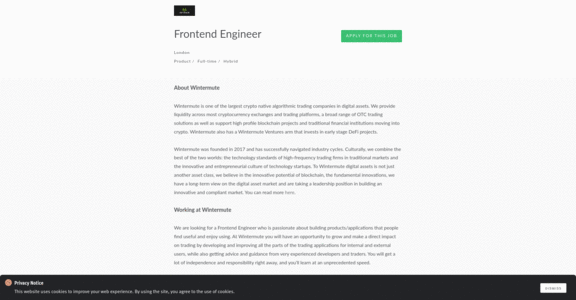 This job for a Frontend Engineer requires at least 5 years of experience and knowledge of specific technologies and frameworks, which is similar to many other frontend engineer roles in the financial and trading sector.